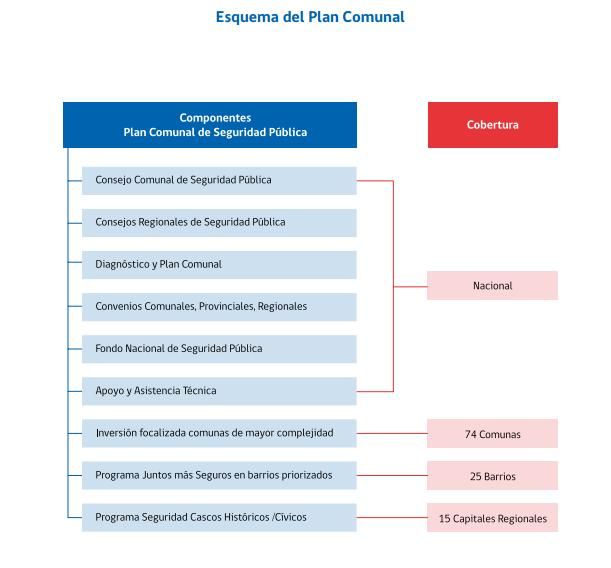 1- Plan Comunal de Seguridad. Este eje entregará herramientas para priorizar el liderazgo local a través de municipios. El objetivo es que las comunidades decidan sus prioridades en la prevención del delito, fruto de un trabajo con las autoridades territoriales. A pesar de que se desarrollará en todas las comunas de Chile, los recursos se focalizarán en las 74 que concentran el 82% de las denuncias por delitos.