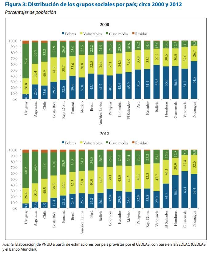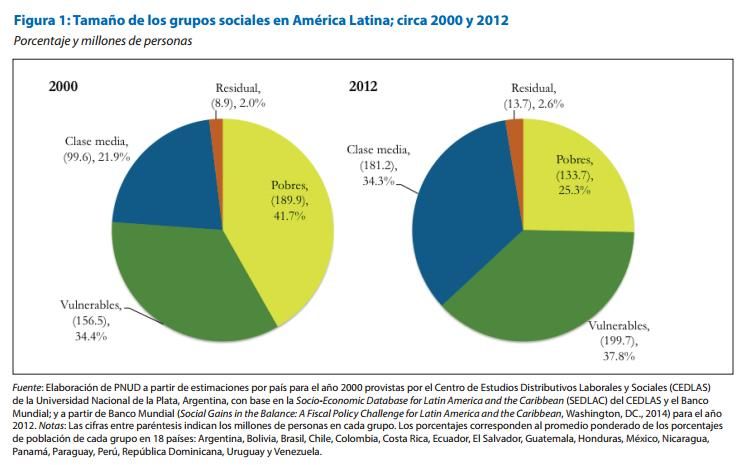 Asimismo, la población vulnerable (con ingresos de entre 4 y 10 dólares diarios) también aumentó del 35% de la población latinoamericana en 2000 al 38% en 2012.