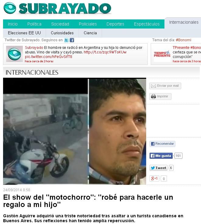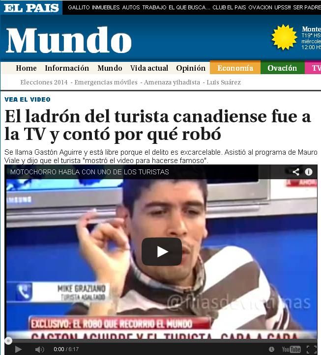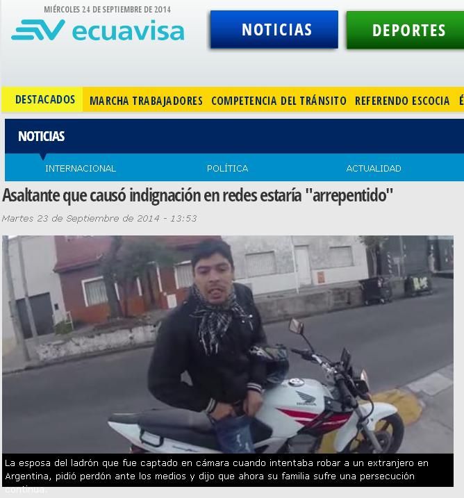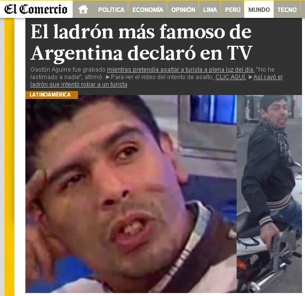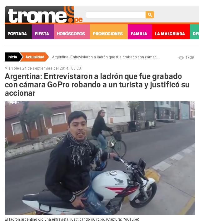 La aparición en el canal América del motochorro cuyo accionar se hizo viral en las redes luego de que su víctima, un turista canadiense, lo captara con su cámara GoPro, ya repercute en los diarios del exterior y lo muestra como una "postal" de la realidad de nuestro país.
