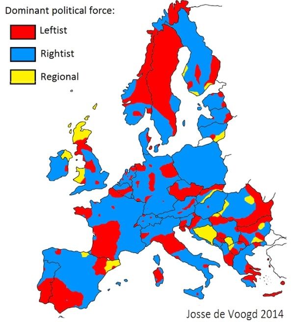 Josse de Voogd creó un mapa de Europa que muestra las tendencias ideológicas por municipios y regiones. El holandés lo hizo pero The Economist lo tomó y lo difundió junto con el análisis de por qué votan a la izquierda, la derecha o a expresiones políticas localistas.