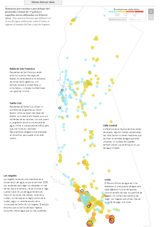 El gobernador Jerry Brown dispuso reducir el consumo en 24%. Las comunidades con el consumo per capita más alto serán las más perjudicadas y tendrán que recortar su consumo en hasta el 35%, según dice el mencionado diario.