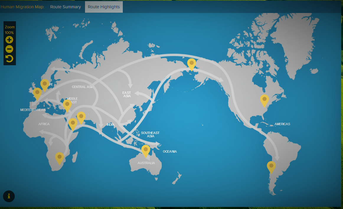 Científicos que investigan, a través de esta iniciativa, las preguntas fundamentales acerca de dónde venimos y cómo el ser humano llegó a poblar la Tierra, elaboraron el siguiente mapa (hacer clic en la imagen).