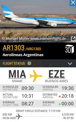 Del mismo, los pilotos tuvieron que modificar sus rutas y evitar el huracán que por ahora se sigue desplazando por El Caribe con rumbo a Estados Unidos. Uno de los últimos aviones en salir desde Miami fue un avión de Aerolíneas Argentinas, específicamente el vuelo 1303 que tuvo que bordear la tormenta para poder seguir su ruta hacia el aeropuerto de Ezeiza, donde se espera que aterrice a las 19.30.