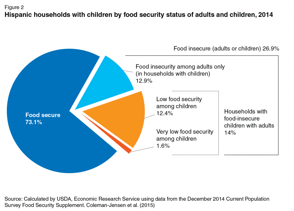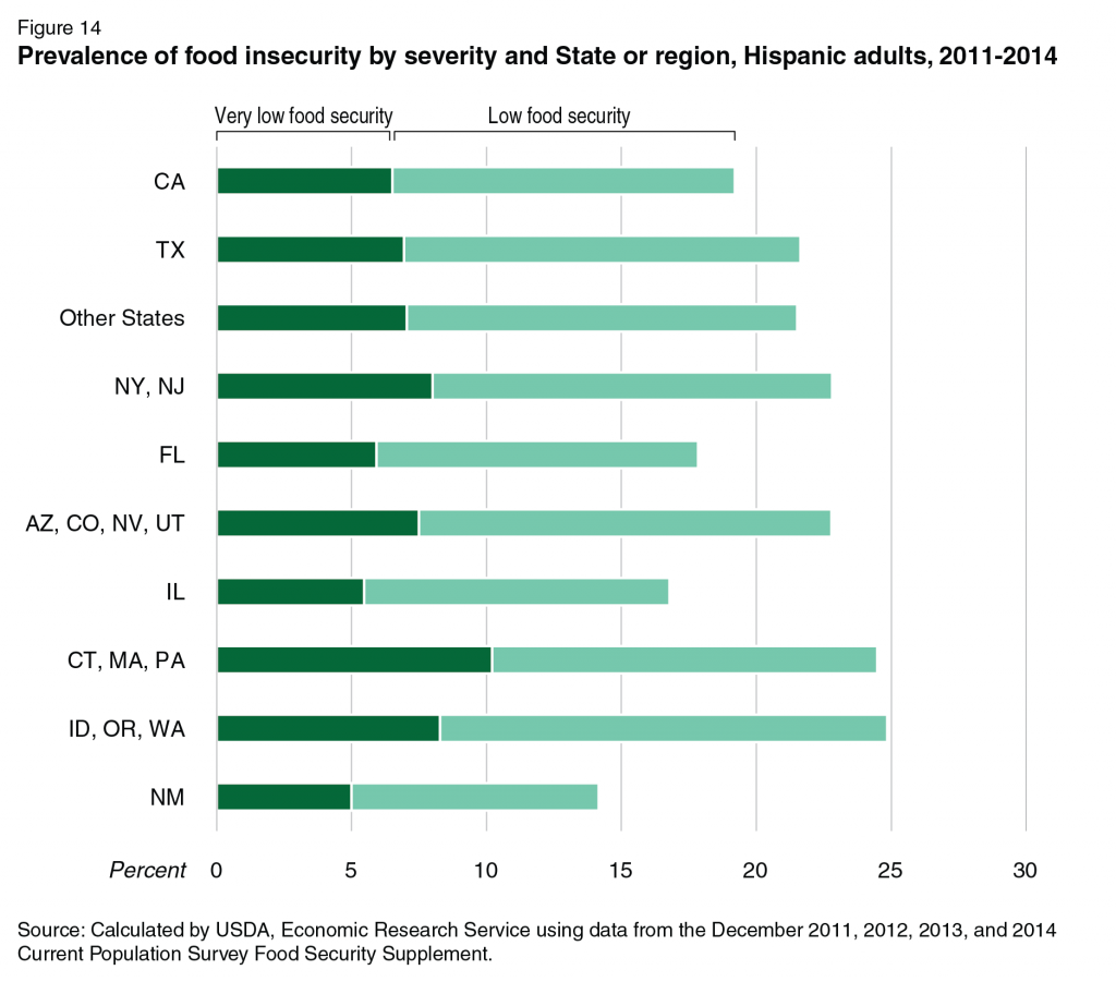 En la categoría de seguridad alimentaria “muy baja” caen el 6,9% de los hogares hispanos, en comparación con el 4,5% de los hogares blancos y el 10,4% de los hogares afroamericanos. La inseguridad alimentaria varía en los subgrupos de la comunidad hispana, dependiendo de su origen nacional, estatus migratorios, composición familiar y región en la que viven. Una gráfica muestra las variaciones en el nivel de seguridad alimentaria en 17 estados con altas concentraciones de hispanos: casi todos tienen un nivel “bajo”, aunque Pennsylvania, Connecticut y Massachusetts tiene una proporción más alta.