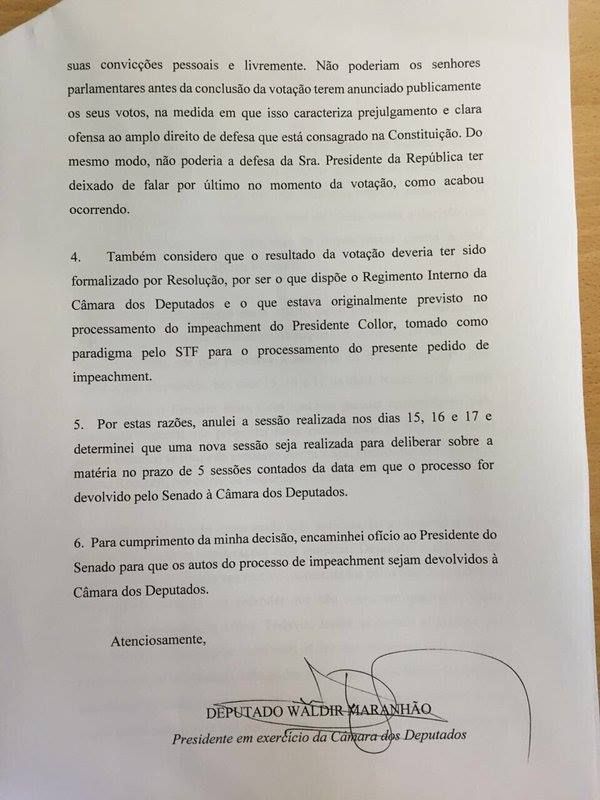 Maranhao tomó la decisión -según pudo conocer Folha- debido a una interpretación en torno a la votación realizada por esa misma cámara. El titular interino de la Cámara -que reemplaza al suspendido Eduardo Cunha, impulsor de la destitución- es partidario de Rousseff.