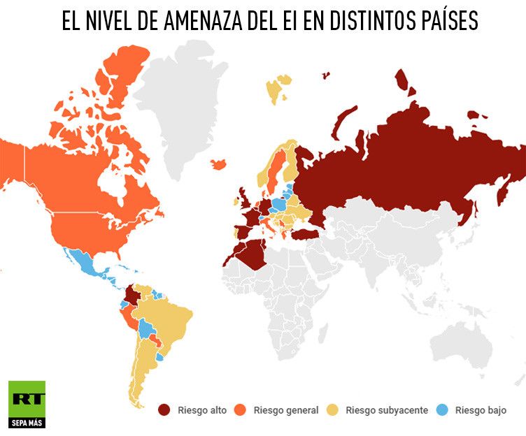 Otro mapa, basado en datos del Ministerio de Relaciones Exteriores británico y publicado hace meses, releva los niveles de amenaza del Estado Islámico en los países del mundo. El nivel más alto de amenaza corresponde a España, Francia, Reino Unido, Alemania, Rusia y Turquía. Mientras tanto, un riesgo general recae sobre Italia, Dinamarca, Suecia, Canadá, EE.UU., Grecia, Marruecos, Túnez, entre otros.