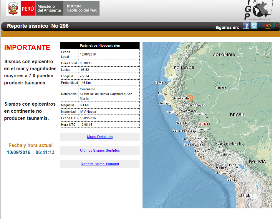 Según la hora local de Perú ocurrió a las 6.41 de este sábado y ya se han registrado varias réplicas de menor magnitud en varios municipios de Perú, como también en localidades de Ecuador como Machala, Loja y Cuenca.