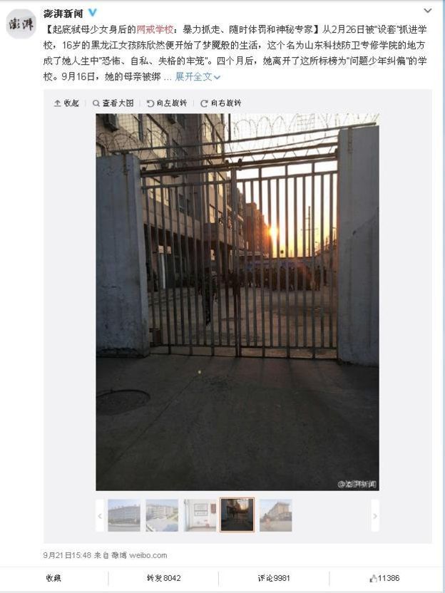 Identificada por medios chinos como Chen Xin, de 16 años, la adolescente había sido enviada a una institución en Shandong, a más de 1.000 km de su casa, especializada en tratar adicciones de "jóvenes rebeldes" El lugar tiene una reputación particular por el tratamiento a la adicción a internet que ofrece.