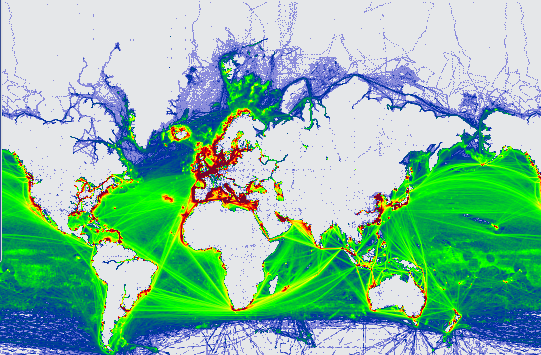 Esta es la la compleja red global de los movimientos de los buques de carga. La trascendencia económica de esta red se ilustra con un simple dato: cerca del 90% del comercio mundial se realiza vía marítima.