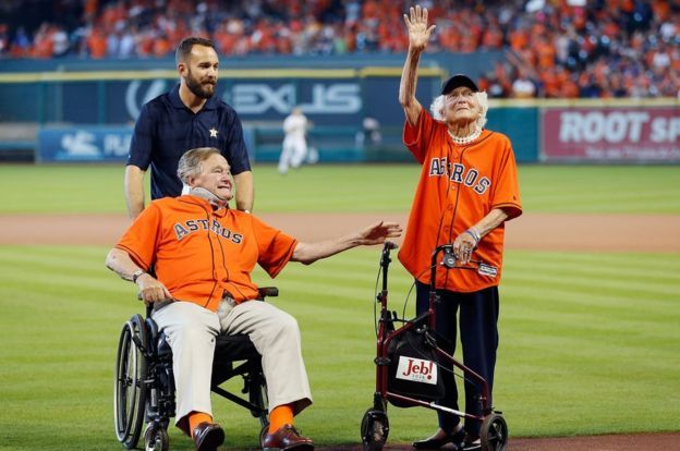 Los Bush, casados desde el 6 de enero de 1945, son el matrimonio de mayor duración entre todas las parejas presidenciales en la historia estadounidense. Pese a su edad, los Bush realizan frecuentes apariciones públicas como en este partido de béisbol en 2015.