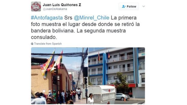 "En Antofagasta, Chile, sin respetar tratados internacionales retiran nuestra bandera nacional", escribió en Twitter este jueves el presidente de Bolivia, Evo Morales.