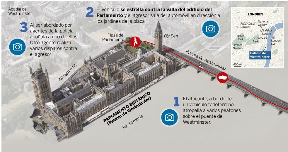 En el siguiente gráfico puede verse cómo fue el sangriento ataque de esta mañana frente al parlamento de Londres.