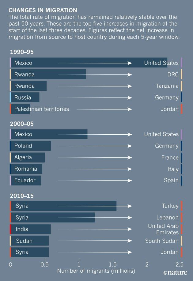 Para la revista Nature, el mapa de las personas que se ven obligadas a emigrar de sus países por diversas razones cambió notoriamente desde 1990 hasta ahora.