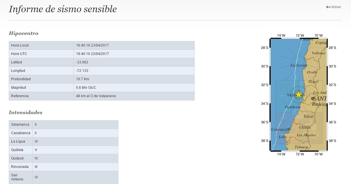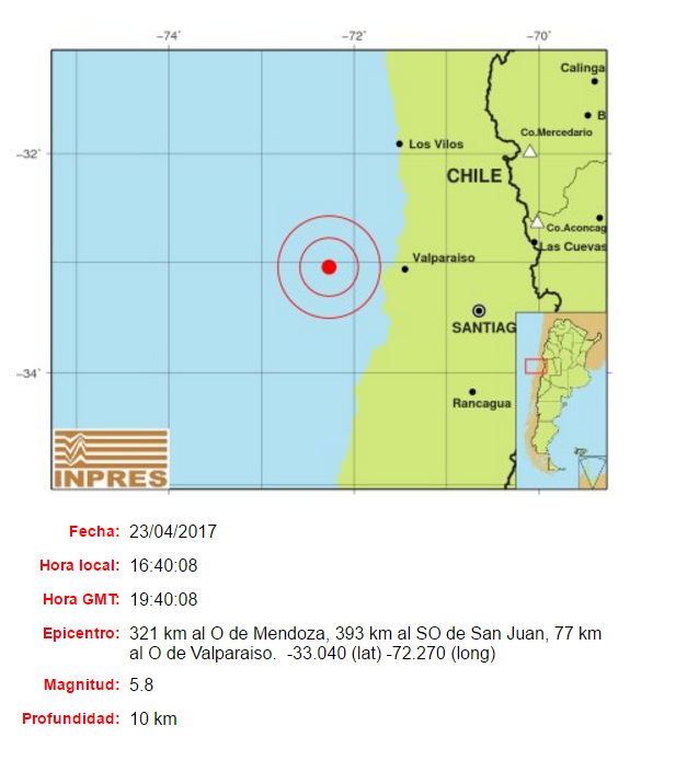 A las 16.40, según el INPRES, hubo un sismo de magnitud 5,8 (5,6 para la Onemi de Chile) con epicentro a 48 kilómetros de Valparaíso, Chile: