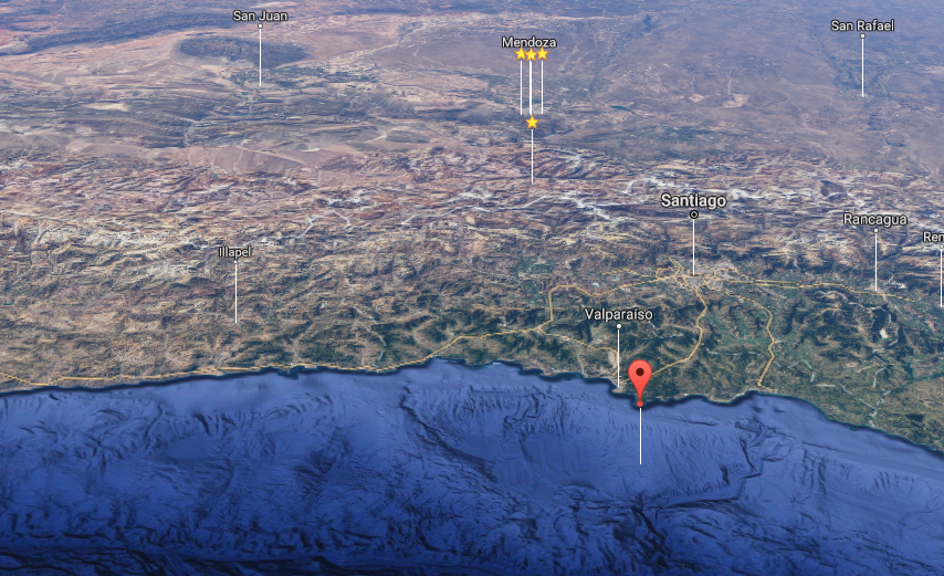 Según el Instituto Nacional de Prevención Sismica (INPRES) el epicentro fue a 321 km al oeste de Mendoza y a 77 kilómetros al oeste de Valparaíso, Chile. Mientras que para el Centro Sismológico Nacional de Chile, fue a sólo 48 kilómetros al oeste de la conocida ciudad portuaria. Ocurrió a las 16.40 y según ambos centros sismológicos, la magnitud fue de 5,6 a 5,8 grados en la escala de Ritchner.