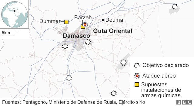 El periodista británico Danny Makki, que se encuentra en el lugar, describió a la BBC el momento de una explosión cerca de su residencia en el occidente de la ciudad: "Todo el vecindario se estremeció, mi casa se sacudió, las ventanas temblaron durante varios minutos". "Los ataques aéreos -con misiles teledirigidos desde un barco de guerra estadounidense en el Mediterráneo o lanzados desde bombarderos franceses y británicos- fueron, según los aliados, en represalia por el supuesto ataque químico del gobierno de Bashar al Asad contra la población de Douma", reflejó BBC..