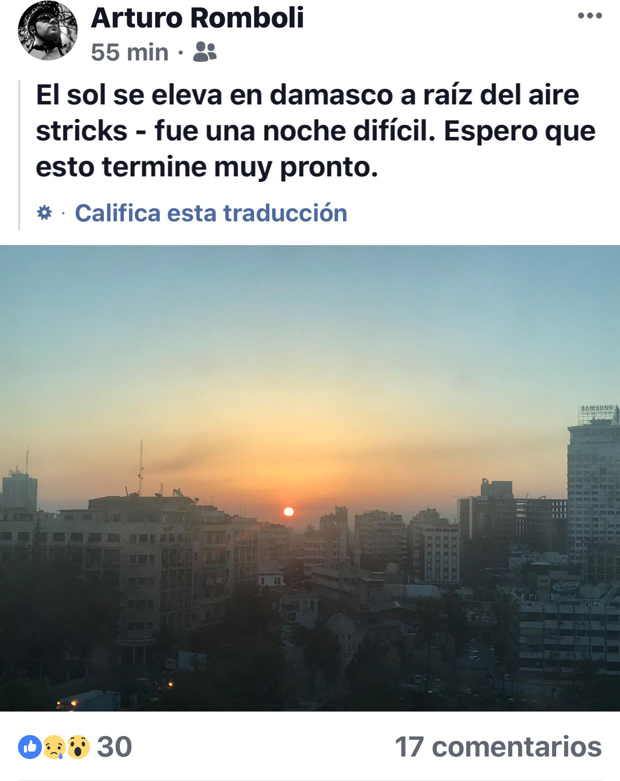 "El sol se eleva en damasco después de los ataques aéreos. Fue una noche difícil. Espero que esto termine muy pronto". Lo que leemos fue el posteo de un mendocino oriundo de San Rafael, Arturo Rombolí, a quien le tocó vivir desde el hotel en la ciudad de Damasco el bombardeo sobre Siria que se produjo anoche liderado por Estados Unidos y sus aliados Francia y Reino Unido, condenados por Rusia, Venezuela, Cuba y el gobierno de Al Asad. Fue la respuesta a un presunto ataque con armas químicas que habría dejado principalmente víctimas en niños sirios.