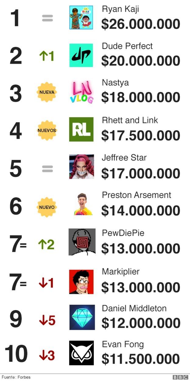 Los canales Dude Perfect y Nastya quedaron en segundo y tercer lugar, con US$20 millones y US$18 millones respectivamente.