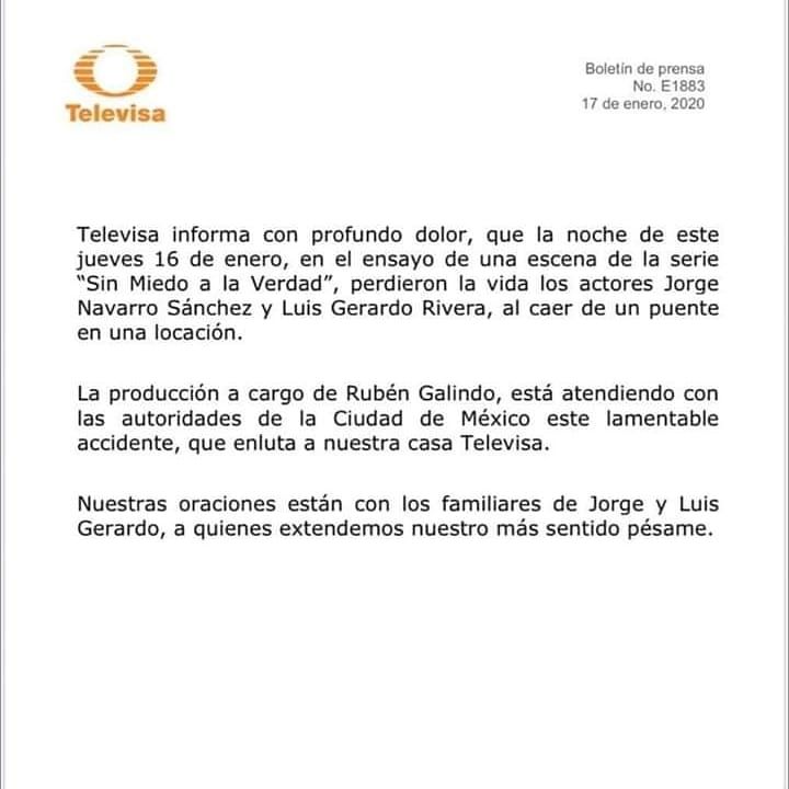 En un comunicado, Televisa destacó que la producción, a cargo de Rubén Galindo, ya se reunió con las autoridades de Ciudad de México por el "lamentable accidente", y ofreció su pésame a las familias.