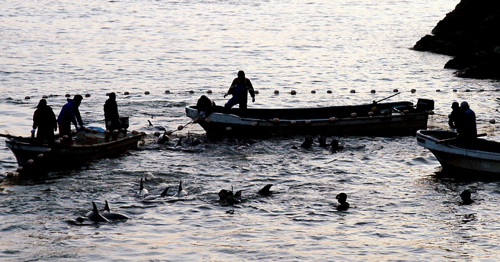 La brutal práctica se realiza en esa costa al sur de Osaka todos los años de septiembre a marzo, cuando está habilitada, a pesar del repudio internacional. El procedimiento consiste en acorralar a un grupo de delfines en la ensenada que ya se encuentra preparada para que los delfines caigan en manos de los buzos que están dispuestos para apuñalarlos.