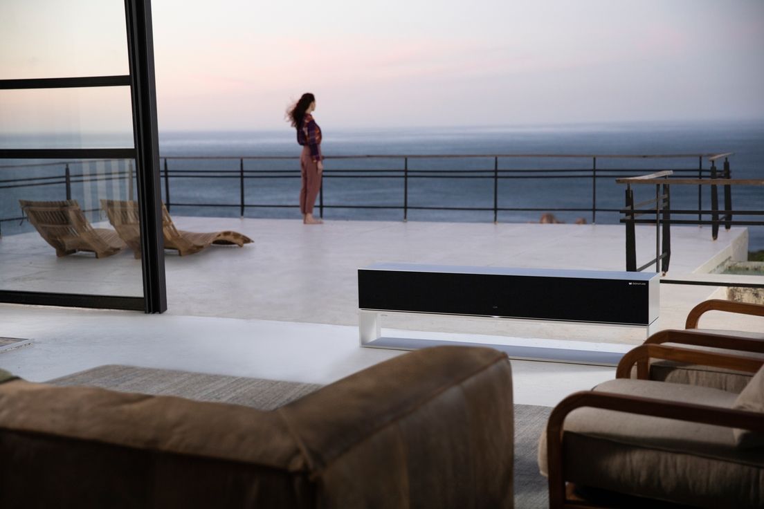 El televisor puede aparecer y ocultarse, completa o parcialmente, en una base de aluminio que está disponible en 4 colores: negro, gris, azul y marrón. "La R en el nombre no solo significa que el televisor es enrollable, sino que el televisor es también revolucionario en el espacio del entretenimiento doméstico, redefiniendo la relación entre un televisor que puede desaparecer de la vista con solo tocar un botón y el espacio circundante", reza un comunicado de la compañía.