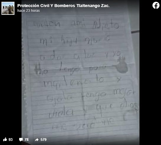 En su página de Facebook, el cuerpo de rescate publicó la nota que dejó el representante del recién nacido: "Cuiden a mi nieto. Mi hija murió al dar a luz y yo no tengo para mantenerlo. Ojalá tenga mejor vida y que Dios me perdone".