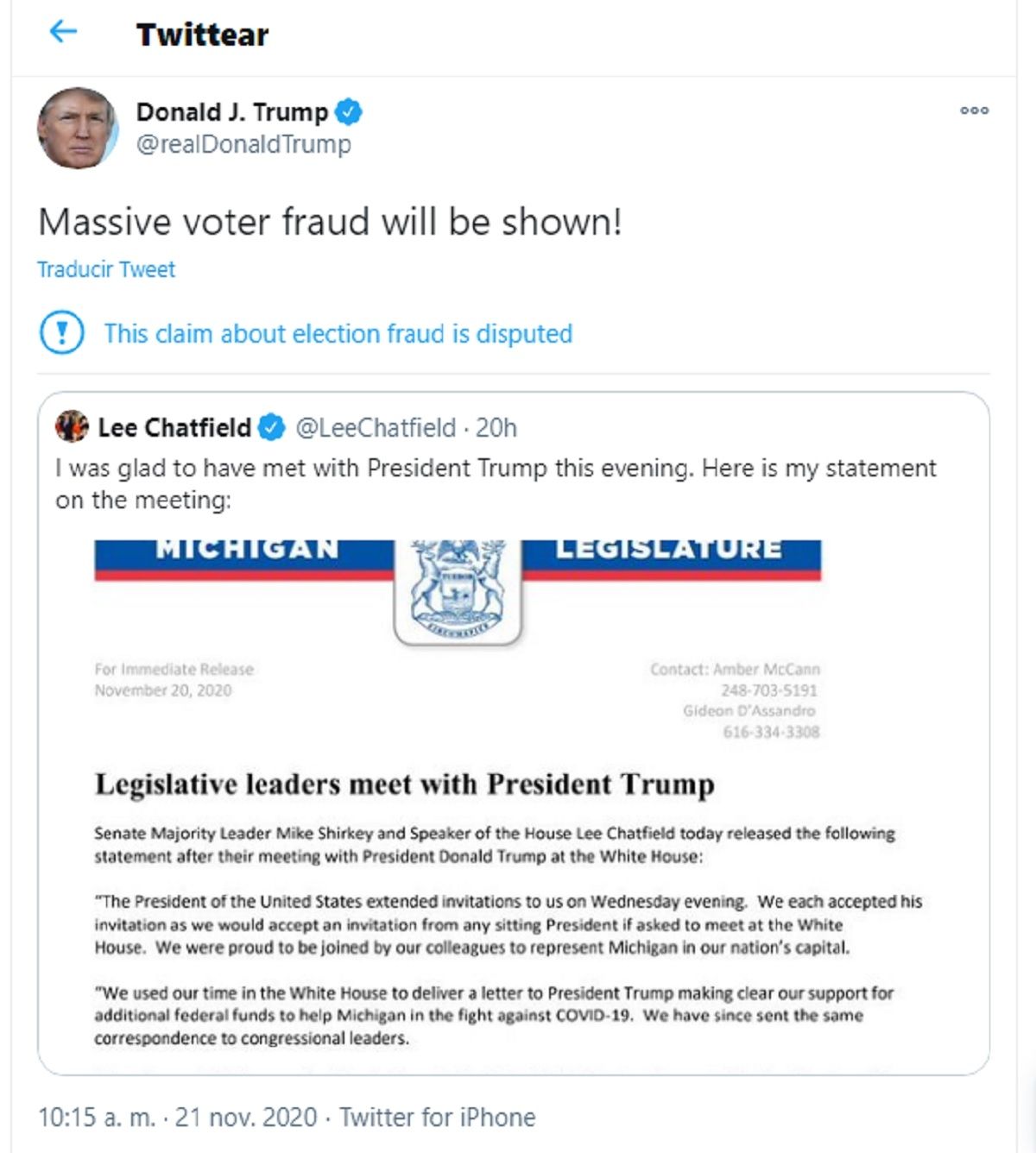 De cualquier forma, Donald Trump prefirió utilizar su usuario personal @realDonaldTrump mucho más que la oficial. Es en esa cuenta donde vertió las acusaciones de fraude respecto a las elecciones del 3 de noviembre, que fueron etiquetadas en más de una oportunidad como “en disputa” o “desinformación” por Twitter.