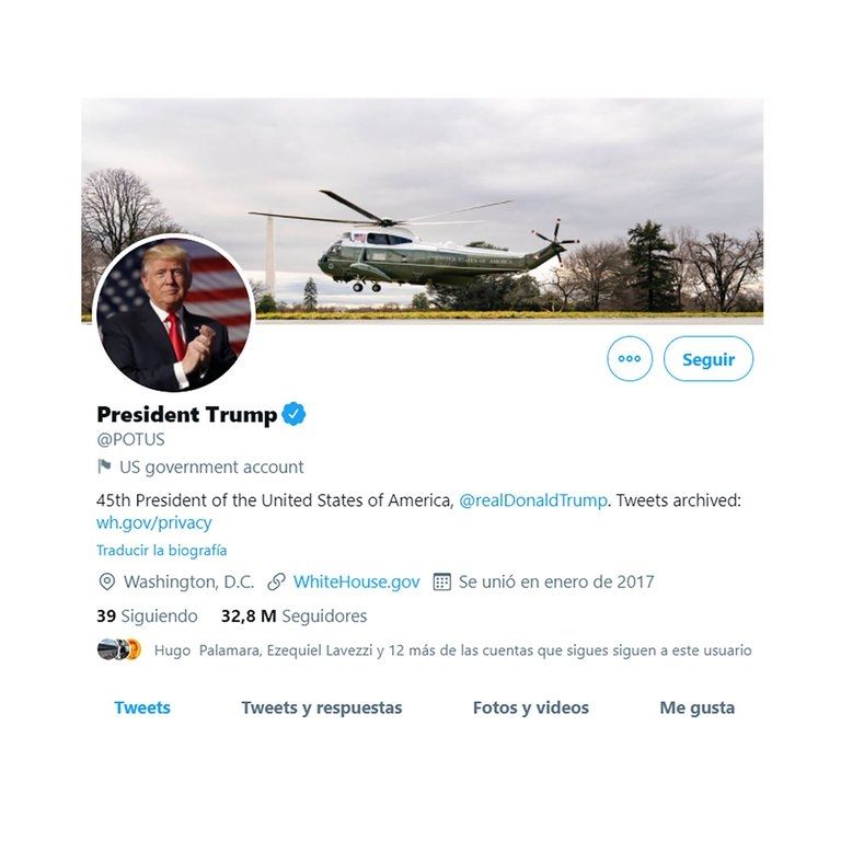 @POTUS (President Of The United States, Presidente de Estados Unidos), cuenta específica del presidente, tiene más de 32 millones de seguidores. Twitter informó que se archivarán todas las publicaciones de la administración Trump y la cuenta quedará limpia.