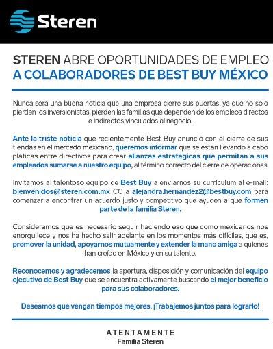 “Ante la triste noticia que recientemente Best Buy anunció con el cierre de sus tiendas en el mercado mexicano, queremos informar que se están llevando a cabo pláticas entre directivos para crear alianzas estratégicas que permitan a sus empleados sumarse a nuestro equipo, al término correcto del cierre de operaciones”, fueron las palabras del comunicado oficial de Steren.