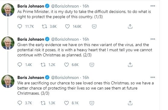 El primer ministro, Johnson, dijo: "Cuando la ciencia cambia, nosotros debemos cambiar nuestra respuesta. Cuando el virus cambia su método de ataque, nosotros debemos cambiar nuestro método de defensa. Como primer ministro del Reino Unido creo, sinceramente, que no me queda otra alternativa".