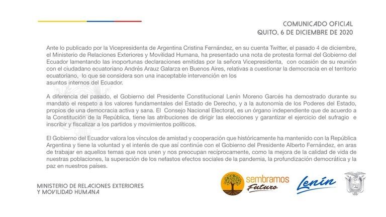 “Ante lo publicado por la vicepresidenta de Argentina Cristina Fernández, en su cuenta de Twitter el pasado 4 de diciembre, el Ministerio de Relaciones Exteriores y Movilidad Humana, ha presentado una nota de protesta formal del Gobierno del Ecuador lamentando las inoportunas declaraciones emitidas por la señor vicepresidenta, con ocasión de su reunión con el ciudadano ecuatoriano Andrés Arauz Galarza en Buenos Aires, relativas a cuestionar la democracia en el territorio asuntos internos del Ecuador”, expresa el texto emitido por la cancillería ecuatoriana.