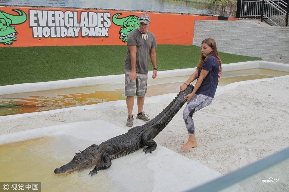 En las imágenes se puede ver cómo el gigante aligátor se acerca de manera muy mansa a la joven y espera pacientemente a ser alimentado.