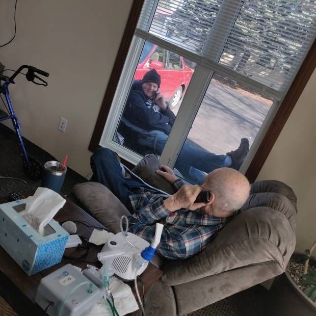 La foto revelaba al anciano sentado en un sillón dentro de su habitación mientras su hijo estaba sentado afuera de la ventana, mientras hablaban por teléfono entre sí.
