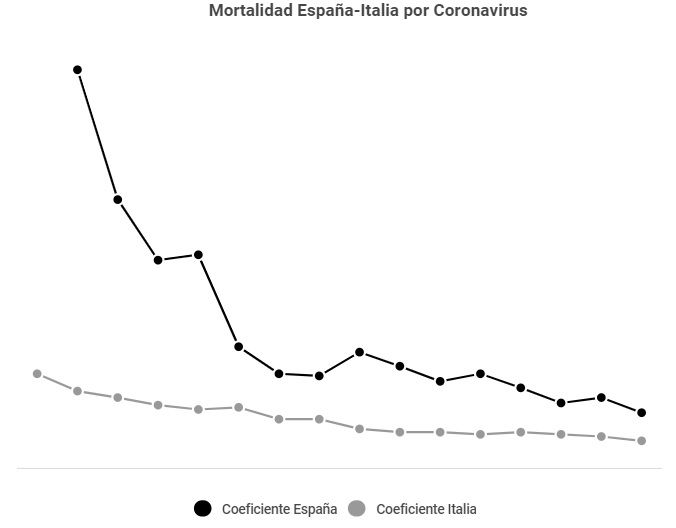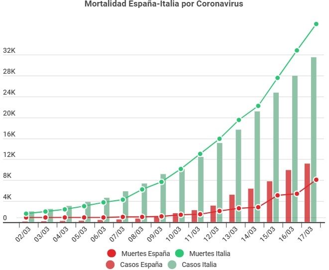 Sin embargo, la diferencia ha persistido en el tiempo y según los datos hasta el martes 17 de marzo, España continúa triplicando al día de hoy la mortalidad italiana, con 491 muertes en España por Covid-19 que contrastan con los 148 de Italia en el mismo periodo.
