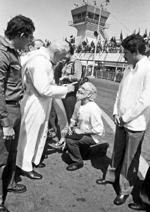 La escena fue la manifestación más pública del conflicto entre Cardenal y la jerarquía católica por causa de su compromiso con la Revolución Sandinista (1979-1990), durante la que se desempeñó como ministro de Cultura.