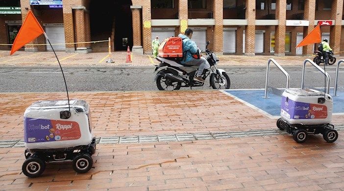 Unos 15 robots recorren las calles de Medellín para realizar entregas de pedidos a domicilios como parte de un plan piloto puesto en marcha por las compañías colombianas Rappi y KiwiBot para evitar el contacto persona-persona en medio la cuarentena para combatir el coronavirus.