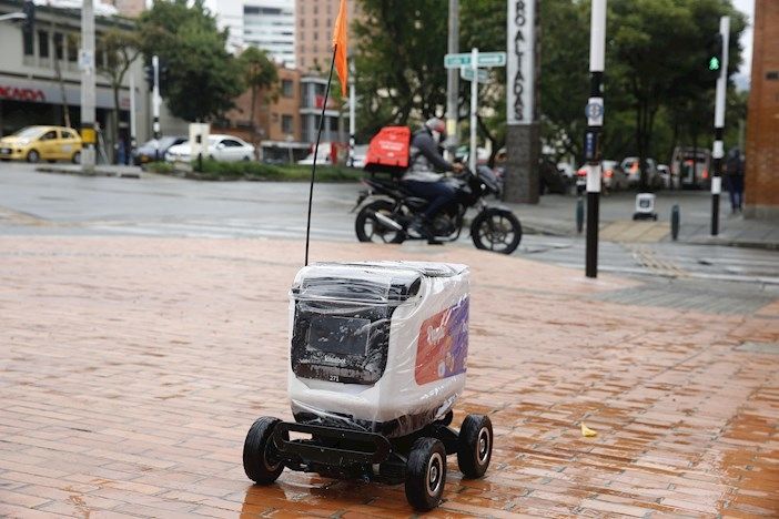 Los robots de KiwiBot, una compañía de origen colombiano que tiene su base en Estados Unidos y un centro de innovación en Medellín, cuentan con capacidad de 35 centímetros cuadrados, funcionan con batería eléctrica y pueden llevar hasta ocho kilos.