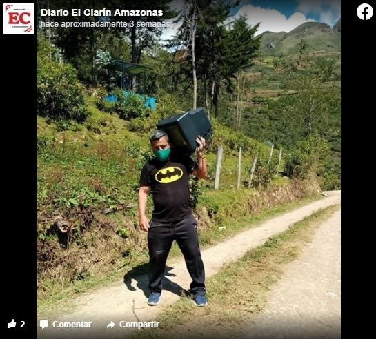 En otra imagen aparece el propio Rojas con uno de esos televisores cargado en el hombro, en medio de un camino rural. Casualmente viste una camiseta con el logo del famoso superhéroe de los cómics, Batman, en acertada alegoría a que no todos los superhéroes llevan capa.