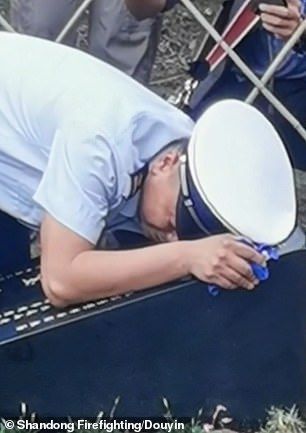 En la filmación se puede ver como uno de los soldados que despedía al spaniel Tiambao, un perro de rescate chino, no puede contener el llanto y se quiebra emocionalmente sobre la lápida del pequeño animal.