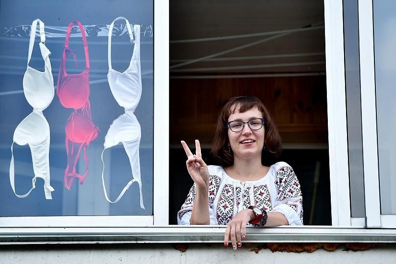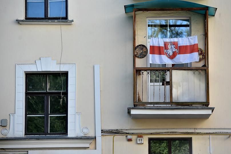 Los bielorrusos están colgando los colores de la bandera presoviética del país en sus ventanas y balcones en pequeños actos de desafío contra el presidente Alexander Lukashenko.