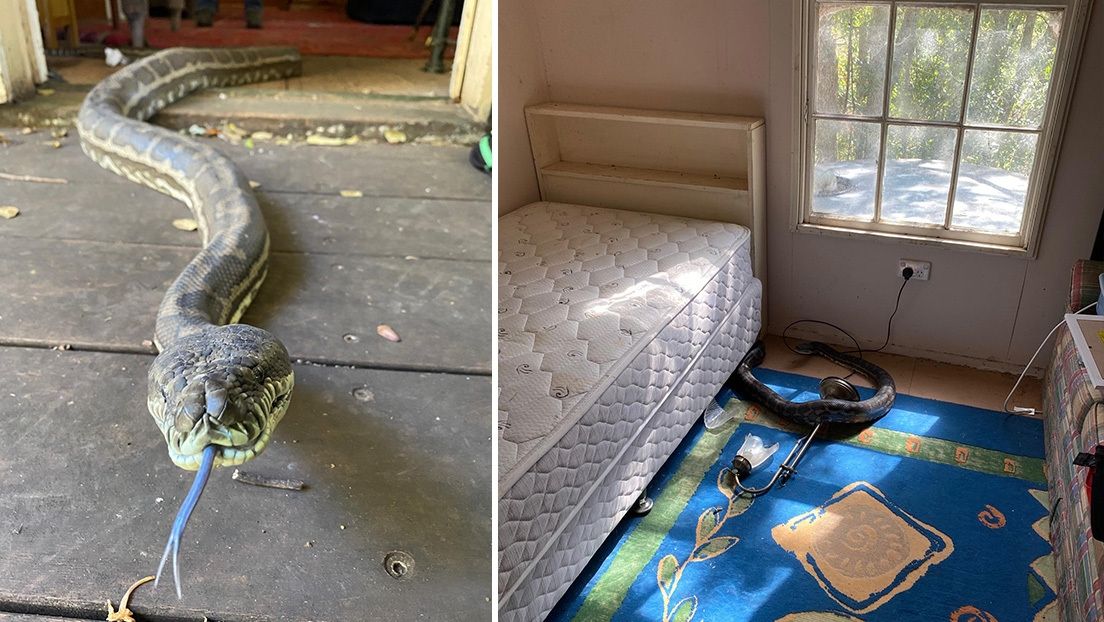 Un residente de la localidad de Laceys Creek (Queensland, Australia) descubrió un agujero en el techo de su cocina al regresar a casa este lunes. Como no había habido ninguna tormenta en los días anteriores, el hombre empezó a buscar lo que pudo haber causado el daño y encontró en el suelo de la vivienda a las responsables: dos pitones de gran tamaño.