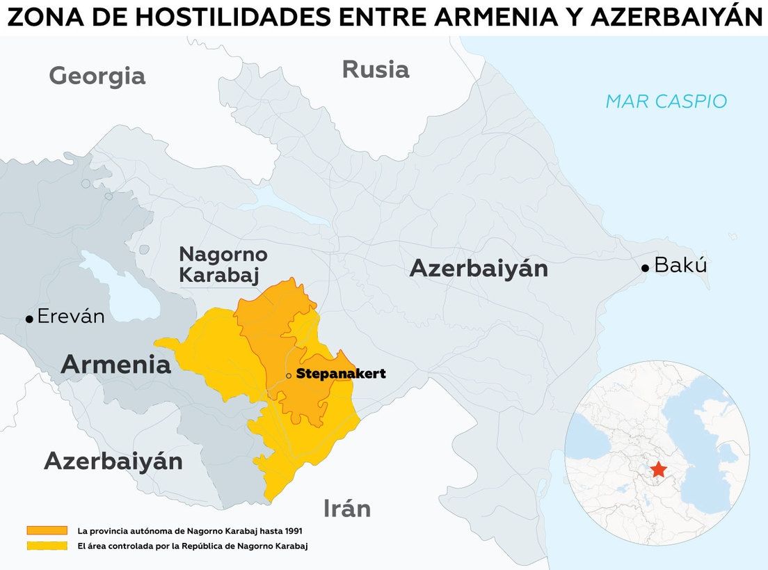 * Ereván y Bakú tienen relaciones tensas desde el inicio del conflicto por la región de Nagorno Karabaj en febrero de 1988, cuando el enclave autónomo, poblado mayormente por armenios, anunció su salida de la entonces república soviética de Azerbaiyán.