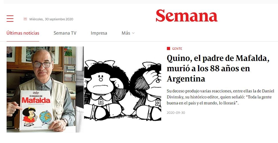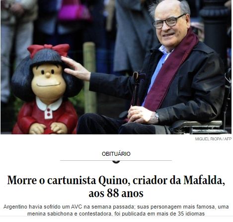 El diario brasileño O Globo también se hizo eco de la noticia y despidió con cariño al creador de Mafalda. Lo mismo hicieron el diario chileno El Mercurio y el periódico colombiano La Semana.