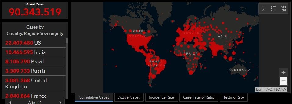 Conforme al cómputo que aparece en la página web de esa universidad independiente, el número total de infectados es de 90.270.044, con Estados Unidos a la cabeza con 22.406.747, seguido de la India con 10.466.595, Brasil con 8.105.790, Rusia con 3.366.715 y el Reino Unido con 3.081.368.