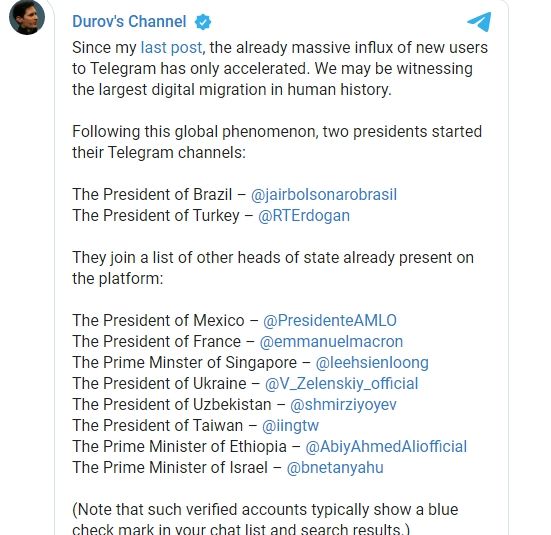 En ese sentido, Dúrov manifestó que los canales oficiales siempre tienen "una marca de verificación azul", Además mostró su satisfacción al ver que figuras emblemáticas potan por su aplicación. Dijo "sentirse honrado de que los líderes políticos, así como numerosas organizaciones públicas, confíen en Telegram para combatir la desinformación".