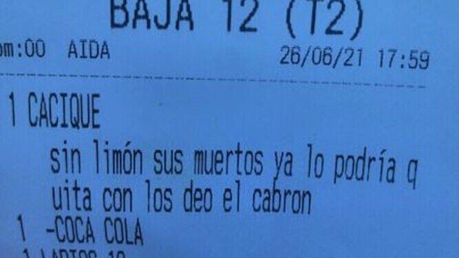 Alejandro Sánchez Nieto había pedido el trago que acá se conoce como Cuba Libre, es decir, ron con bebida cola, limón y hielo. Pero le explicó al mozo que lo quería sin limón. Nada del otro mundo. Al parecer, al camarero no le gustó su actitud, ya que en el ticket se leyó: "Cacique sin limón, sus muertos, ya lo podría quitar con los deo (dedos) el cabrón". Cacique era la marca del ron, el resto, un insulto por haberlo pedido sin limón.