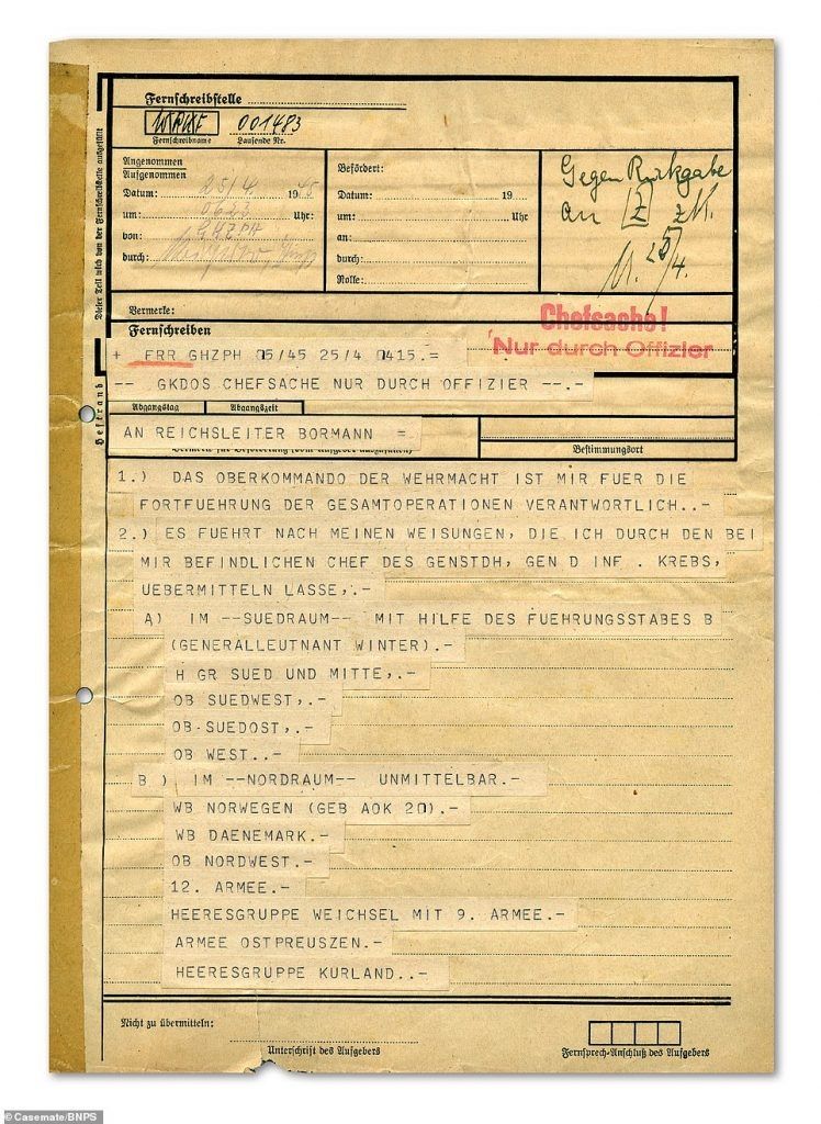 El telegrama data cinco días antes del suicidio y revela la paranoia de Hitler en sus últimos días, ya que esas tropas habían sido destruidas o estaban incomunicadas. Otro telegrama enviado por el secretario de Hitler, Martin Bormann, anuncia los planes de suicidio de Hitler: “La situación aquí es desesperada. El jefe se quedará aquí sin importar lo que pase. Está claro”.