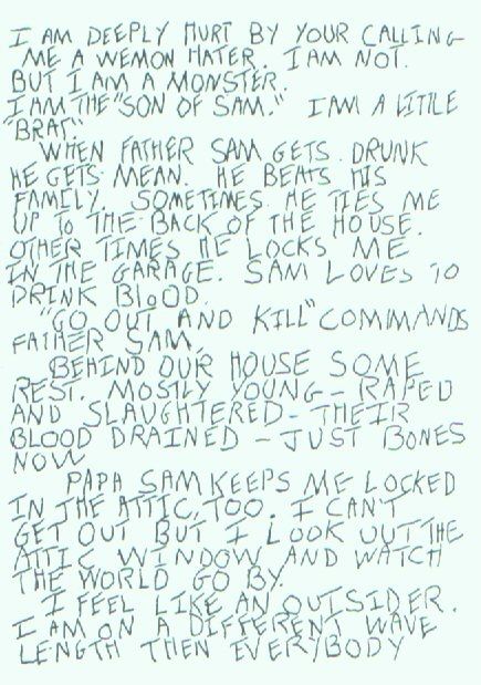 En medio del caos, envió una carta a la policía. “Me duele profundamente que me llames odiador de mujeres. Yo no soy. Pero soy un monstruo. Soy el "Hijo de Sam". Soy un pequeño "mocoso”.”, comenzaba su misiva. El documento llegó a los medios. Como a muchos asesinos en serie, a Berkowitz esa exposición, y el sentimiento de invulnerabilidad, le generaron placer.