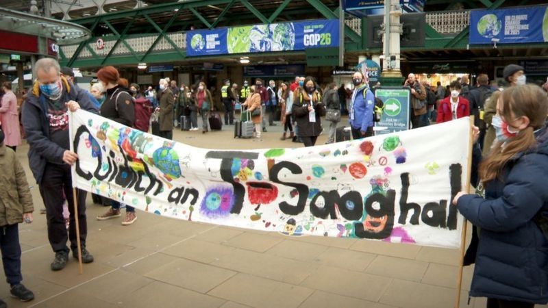 La marcha pasó por el extremo oeste de la ciudad, por la sede de la COP26 en el Scottish Events Campus, y luego se dirigió al centro.