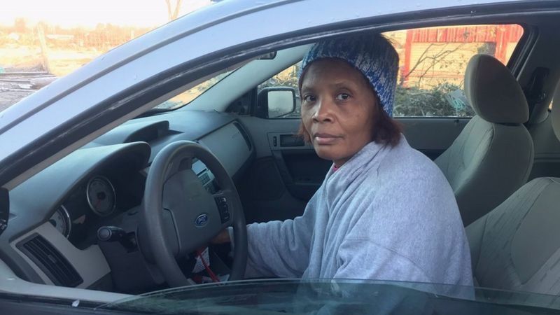Deeneen es conductora de un autobús escolar. Cerca de allí, uno de esos autobuses está volcado de lado, con el motor colgando.